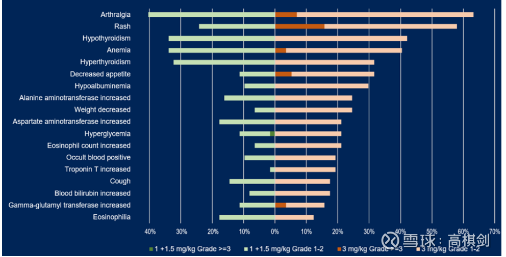 而且,我们去看IBI363的在NSCLC的副作用,3mg组3级以上的TRAE大概40%左右,而其中大部分都是关节痛、皮疹和甲状腺异常,有几点需要强调一下:一是这些副作用反而没有中性粒细胞减少等对患者生存影响那么大,而且反而没有PD1常见的致命性副作用——间质性肺炎等;二是这几个副作用也是可以管理的,比如关节痛吃止痛药等,公司与医生也说了,之前是对IBI363的经验不足,现在做一些预处理,包括皮疹等很多就不会发展到三期了;四是剔除掉关节痛和皮疹这两个比较高频但不致命的副作用后,IBI363的3级及以上TRAE预计基本上和其他PD1大差不差了!