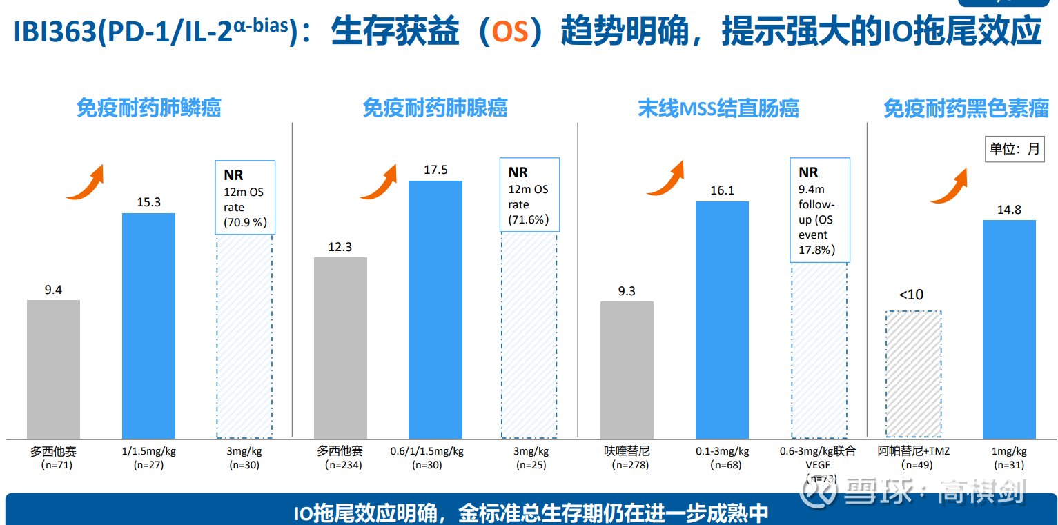 具体数字我就不再罗列了,有兴趣的可以去翻翻我以前写的文章,IBI363无论在NSCLC、还是在CRC及黑色素瘤都显现出与众不同的长生存获益趋势!