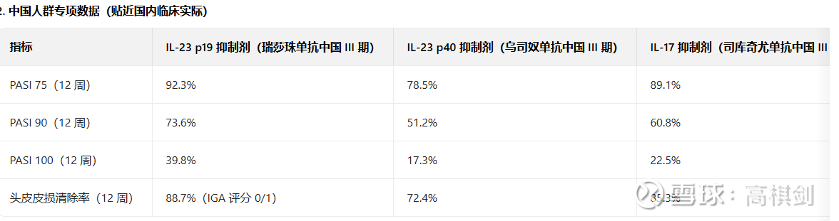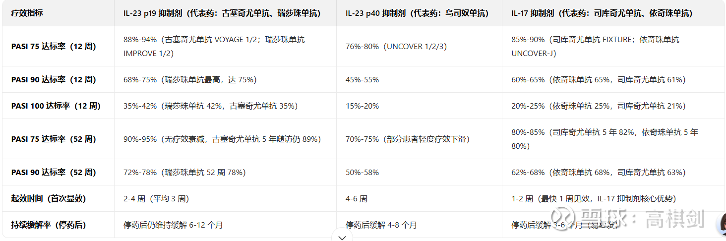从这个角度上看,IL23是银屑病发病的源头,而IL17是下游因子,而INF-α是局部的因子,所以从理论上来说IL23好于IL17,而IL23 p19和IL23 p40(通常也可以说是IL23/IL12),p19 抑制剂:无脱靶效应,仅作用于银屑病核心致病通路,对正常免疫防御干扰极小;但p40 抑制剂:因阻断 IL-12,可能影响机体对胞内病原体(如结核、沙门氏菌)的免疫应答,而且从疗效上来说,p19也明显高于p40.