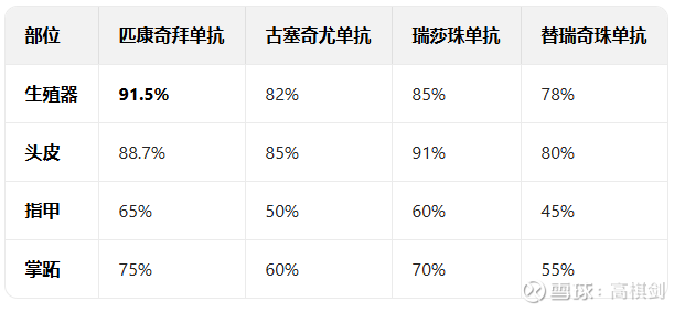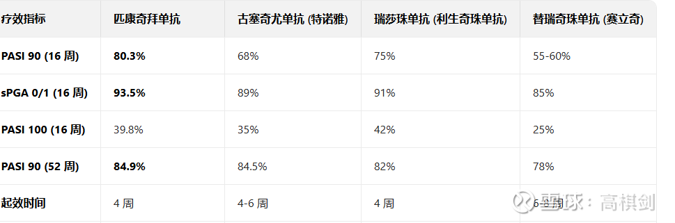 匹康奇拜单抗的设计使其即使在IL23 p19中也是最优的,不仅给药频率低,而且疗效特别显著,尤其是针对特殊部位难治的银屑病患者更是如此,我们对比强生的古塞奇尤单抗、艾伯维的利生奇珠单抗和康哲药业引进的替瑞奇珠单抗,无论是短期疗效,比如16周的PASI 90(通常被视为 “皮损几乎完全清除,或者说PASI评分较治疗前(基线)下降≥90%的比例),匹康奇拜单抗达到80.3%,是唯一一个超80%的单抗,而且长期有效率(PASI90 52周)达到84.9%,也好于其他IL23 p19单抗,其中康哲引进的替瑞奇珠单抗是疗效最差的。
