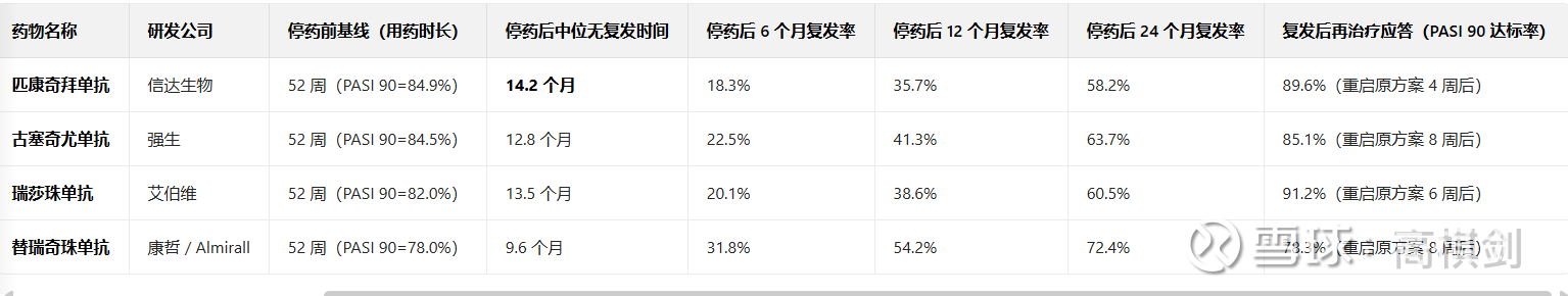 不仅如此,在银屑病有效清除且停药后,匹康奇拜单抗无复发控制时间也是最长的,且的复发率也是最低的。