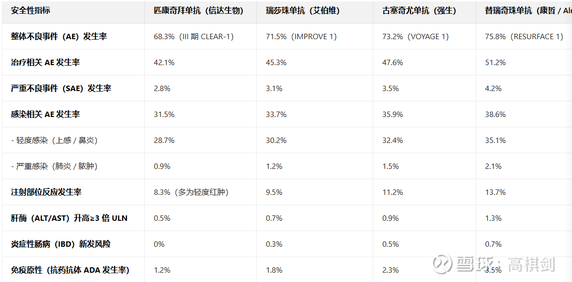 就安全性而言,匹康奇拜单抗不良率也是最好的,匹康奇拜单抗凭借全人源化设计、Fc 片段 YTE 突变及高靶向性,在不良反应发生率、严重风险(感染、IBD、肝毒性)、免疫原性等方面均表现最优,是安全性优先场景下的首选药物
