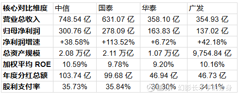 【深度点评】 从上述硬核数据可以清晰地看出两大阵营。“体量巨头”毫无悬念是国泰海通与中信证券:国泰海通合并后总资产高达 2.11 万亿元,跃居行业首位,而中信证券也紧随其后达到 2.08 万亿元。而在 ROE 的较量上,中信证券与广发证券是当之无愧的“ROE之王”,两家均突破