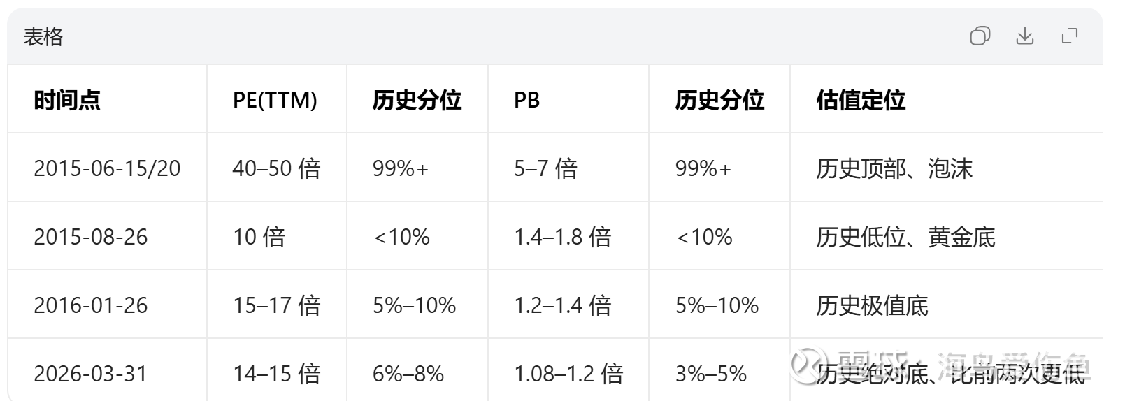 2015年6月-2016年1月,券商指数最大回撤75%,但当前估值已为2015年6月高点的1/4,相当于已完成75%的下跌;从当前位置再跌30%,相当于在2016年1月历史大底上再跌30%,历史上从未出现过;