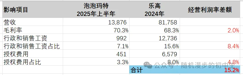 乐高2024年净利率18.6%,和泡泡玛特上半年相差15个百分点,净利润受到其他收益和利息收入的影响。为了更具有可比性,直接对比两家公司财报经营利润率数据,泡泡玛特2025年上半年经营利润率,我用简单的公式(毛利-销售费用-行政费用)/营收=41.8%,而乐高2024年这个数字为25.2%。 也就是说两家公司经营利润率差了16.6个百分点。