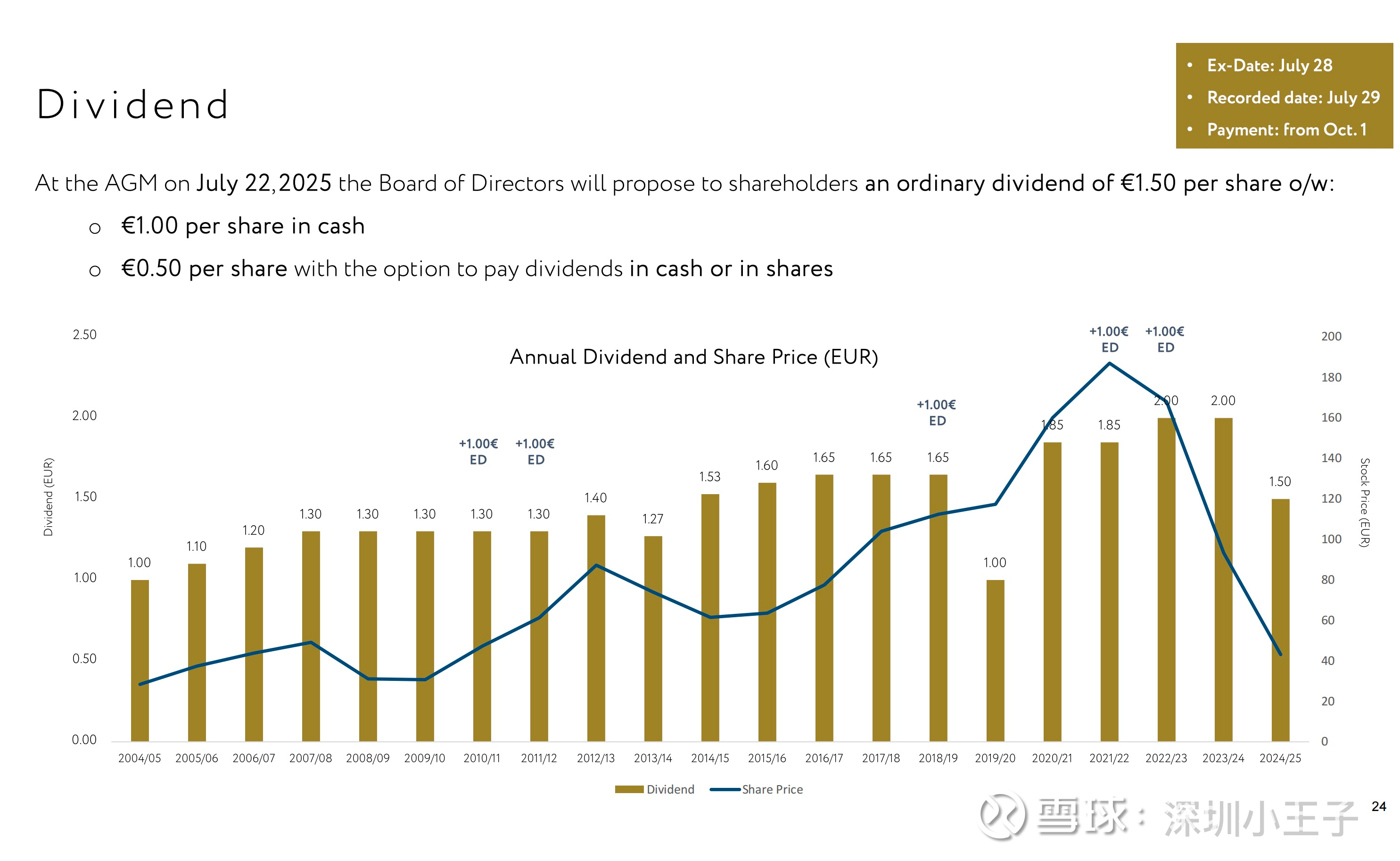 公司近25年保持良好的派息记录,时不时会有额外派息,2021-2023年还有总额3亿多回购,占总市值比例很高了。从这一点来看,欧美公司对股东回报意愿确实要比我们的茅台,五粮液更优!