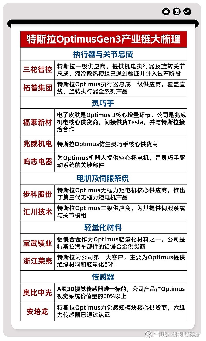 目前,Optimus进展超预期,2025年已启动小批量生产,2026年计划量产5万-10万台,技术端更完成与xAI Grok语音助手的深度整合,运动精度、交互能力显著提升。随着量产节点临近,上游核心零部件产业链率先迎来机遇。