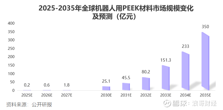 特斯拉Gen2人形机器人,PEEK单机用量为4.2kg,宇树科技H1机器人单机用量为3.2kg。伴随PEEK厂商产能释放和人形机器人量产落地。预计2035年,全球机器人用PEEK材料,市场规模可达350亿元。