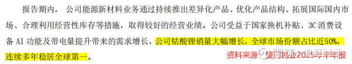 2025年半年报显示,厦门钨业钴酸锂全球市占率近50%,连续多年稳居全球第一。