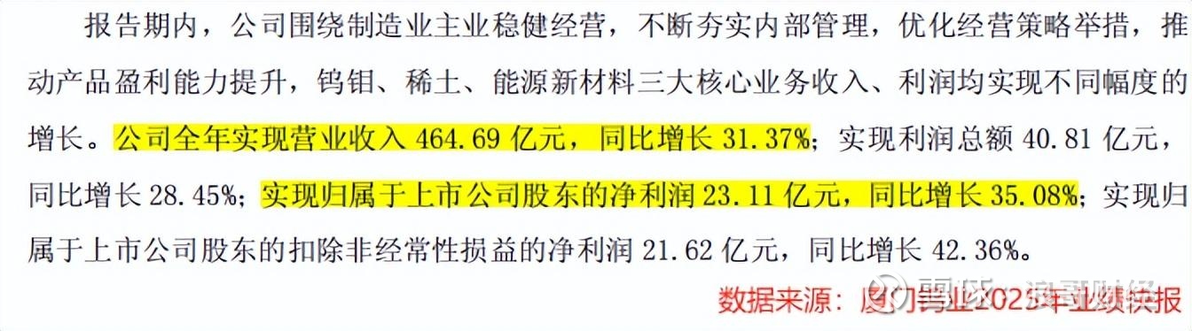 根据业绩快报,2025年厦门钨业实现营收464.69亿元,同比大增31.37%;净利润达23.11亿元,同比飙升35.08%。