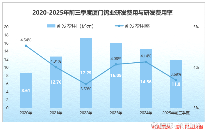 2020到2024年,公司研发费用从8.61亿元增至14.56亿元,2025年前三季度研发费用达11.8亿元,研发费用率稳定在4%左右。