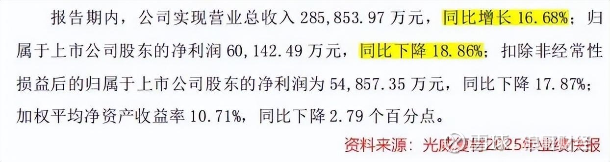 根据业绩快报,光威复材2025年实现营收28.59亿元,同比增长16.68%;净利润6.01亿元,同比下降18.86%,陷入业绩增长困境。