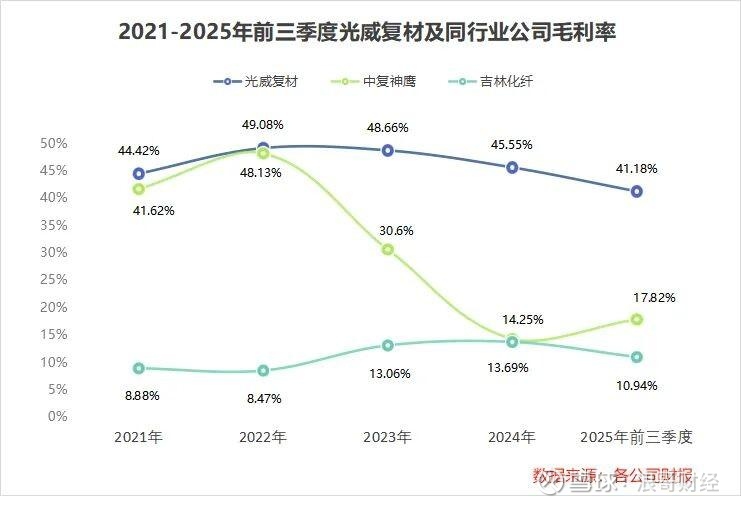 2021年到2025年前三季度,光威复材毛利率均保持在40%以上,领先于中复神鹰、吉林化纤等同行业公司,成为高端碳纤维赛道的佼佼者。