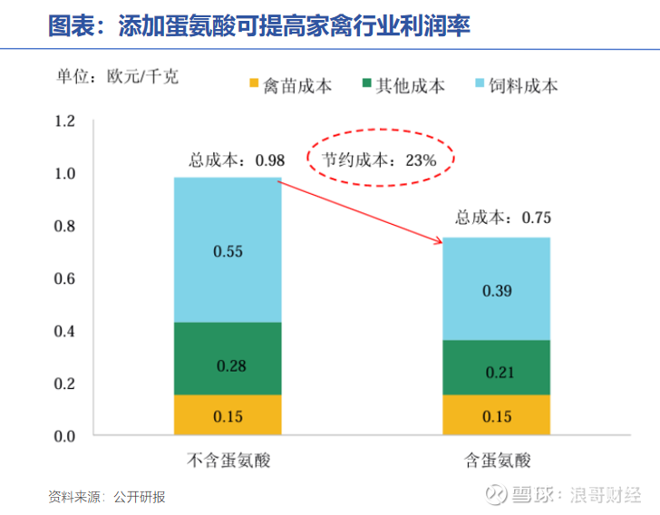 蛋氨酸是仔猪、蛋鸡生长过程中必需的氨基酸之一,而且无法由生物体自身合成,只能以饲料添加等外部方式获得。假设每单位重量饲料中添加0.2%蛋氨酸,每生产1千克成品鸡肉,就能节约23%的生产成本,能有效提高家禽生产行业利润率。