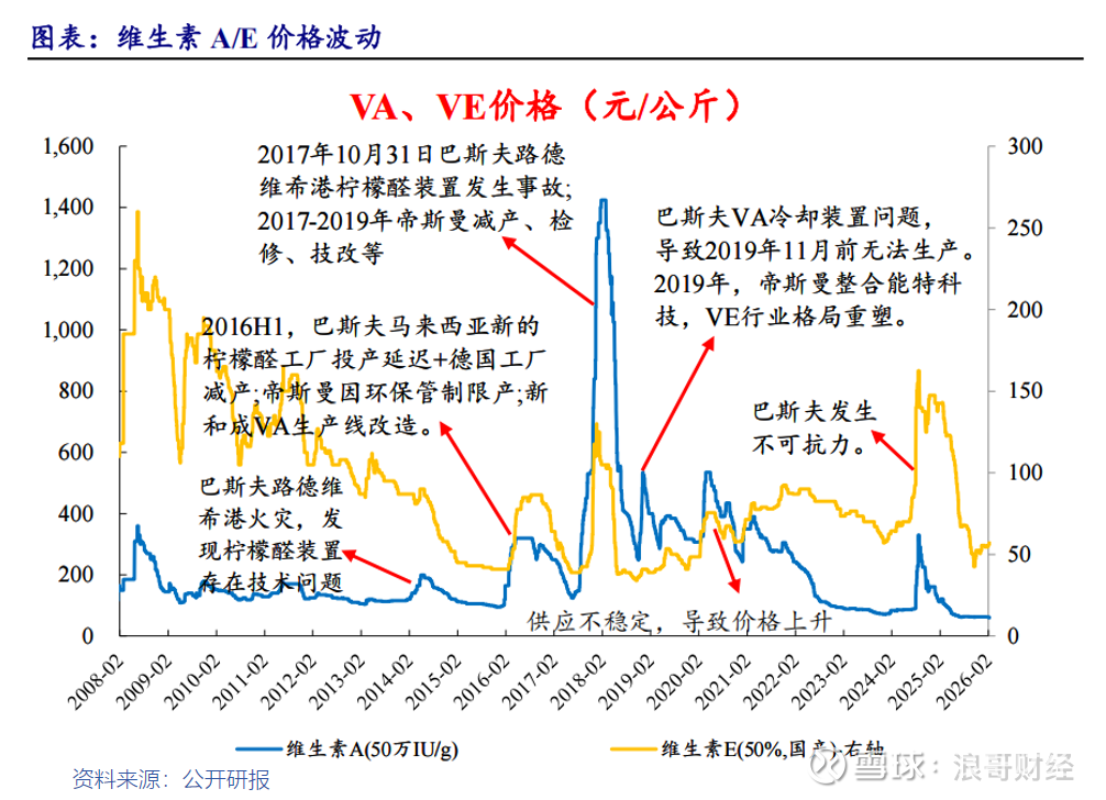 更确切地说,巴斯夫、新和成和安迪苏等头部厂商产能和开工率,会直接影响维生素产品价格。在2017年,巴斯夫柠檬醛装置出现事故,维A维E价格就呈现出明显的双增态势。