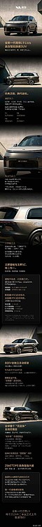 全新一代理想L9。长宽高5255*2000*1810毫米,轴距3125毫米。标配米其林PS5,最高提供22寸轮毂与285mm胎宽。轮胎规格一:21寸,胎宽285,扁平比45轮胎规格二:22寸,胎宽285,扁平比40。5C电池,标配72.7度,CLTC纯电续航420公里,同级最长纯电续航。主动悬架、后轮转向、ADB大灯、双色车身,星环灯变色,全线控底盘、2560TOPS算力自研芯片,单激光雷达或4颗激光雷达、电动拖车钩。