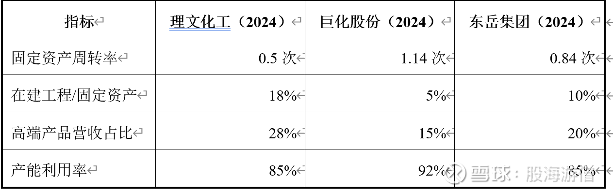公司与同行业代表性公司相比毛利率较高,但净利率并不占优,公司资产周转率较低,可能与公司最近投产项目未投入生产经营相关,根据公司的相关文件披露,目前在建项目有1万吨六氟丙烯(2.24亿元)预计2025年产能利用率达80%,1万吨三氟氯乙烯及配套项目(总投资5亿元):2025年5月环评公示,分两期建设,预计2026年Q2投产,目前处于设备安装阶段,尚未贡献营收。理文化工近三年资本开支占营收比重约15%,显著高于巨化股份(8%)和东岳集团(10%)。2024年固定资产原值同比增长8%,但营收仅增长5%,形成“资产先行、收入滞后”的局面。