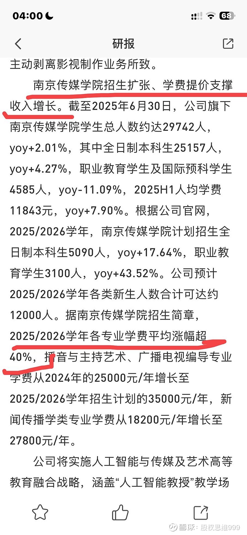 华夏控股(01981) 投资要点: 得益于减值拨备减少和高教核心业务增长,公司在2025H1实现了利润大幅攀升。2025H1,公司实现营收3.79亿元,yoy-1.88%,毛利率54.77%,同比上升4.64pct;税后利润1.40亿元,yoy+136.41%,主要由于2025年公司无需为影视制作和投资业务的主要贸易应收款项以及过渡性贷款计提额外减值,2024H1该项减值总计7962万元;2025H1经调整归母净利润为1.41亿元,yoy+29.73%,经调整 归母净利润率37.07%,同比上升9.03pct,核心盈利能力实现显著 增长。分业务来看:①传媒及艺术高等教育、职业教育及国际教育业务收入3.52亿元,yoy+9.96%,占公司总营收比例为92.86%,较2024H1上升10.00pct,毛利率59.80%。②娱乐及直播电商业务收入0.27亿元,yoy-59.15%,毛利率-10.72%,系公司主动剥离影视制作业务所致。 南京传媒学院招生扩张、学费提价支撑收入增长。截至2025年6月30日,公司旗下南京传媒学院学生总人数约达29742人,yoy+2.01%,其中全日制本科生25157人,yoy+4.27%,职业教育学生及国际预科学生4585人,yoy-11.09%,2025H1人均学费11843元,yoy+7.90%。根据公司官网,2025/2026学年,南京传媒学院计划招生全日制本科生5090人,yoy+17.64%,职业教育学生3100人,yoy+43.52%。公司预计2025/2026学年各类新生人数合计可达约12000人。据南京传媒学院招生简章,2025/2026学年各专业学费平均涨幅超40%,播音与主持艺术、广播电视编导专业学费从2024年的25000元/年增长至2025/2026学年招生计划的35000元/年,新闻传播学类专业学费从18200元/年增长至27800元/年。 公司将实施人工智能与传媒及艺术高等教育融合战略,涵盖“人工智能教授”教学场景与“人工智能艺术课程”知识付费两大核心领域。2025年5月,南京传媒学院出台《AI赋能人才培养实施意见》,明确未来三年从专业布局、课程重构、教学创新、产教融合等维度系统推进,进行“AI+教育”改革。2025年7月,南京传媒学院与AIGC私域大模型服务商炫佳科技合作共建“视听+AI+应用”实践教 学基地,旨在深化产教融合、赋能人才升级。炫佳科技将投入AIGC领域技术专家团队,担任南传客座教授及实训导师,提供课程研发、教材编写、学生实习实训等帮助。 盈利预测与估值:我们预计2025-2027年公司营业收入9.26/11.21/13.59亿元,归母净利润2.84/3.62/4.64亿元,对应PE为9/7/5X。公司作为国内传媒艺术高等教育的领军者,减值压力缓解叠加核心主业量价齐升,盈利能力显著增强,并积极推进“AI+教育”融合战略,有望开启业绩增长的新空间,首次覆盖,给予“买入”评级。 风险提示:市场竞争激烈、高教业务招生进度不及预期、高教业务中学额与学费受政策及监管趋严、直播电商规模化运营挑战、人工智能+教育业务发展前景不明朗等。