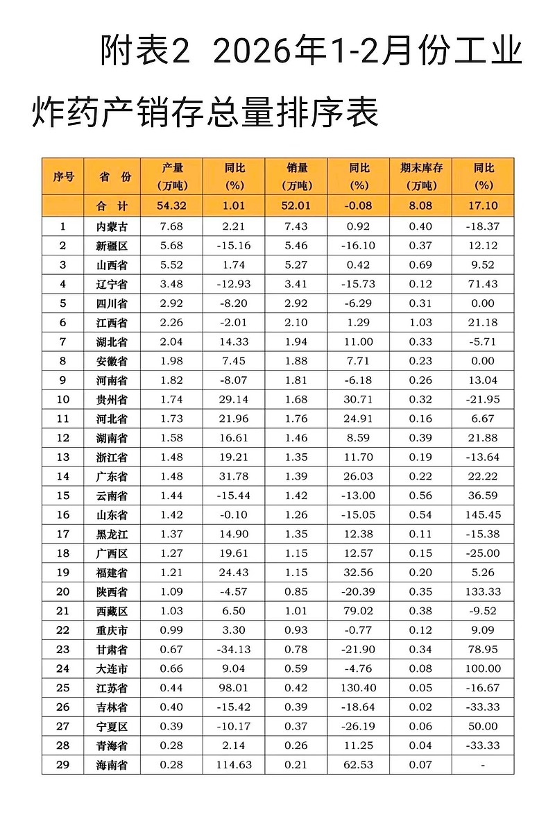 西藏自治区2026年1到2月份民爆淡季不淡,产销两旺,特别是销量同步增长79%,Q1业绩值得期待。