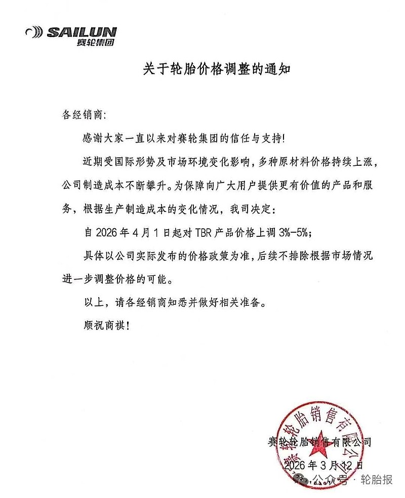 2026年3月12日,轮胎行业涨价潮再掀高潮。赛轮集团、通用股份、物产中大、华盛橡胶、优盛轮胎、贵州轮胎等企业同日官宣调价,正式加入此轮涨价阵营。其中,赛轮集团宣布自4月1日起,对TBR(全钢载重子午线轮胎)产品价格上调3%-5%。$赛轮轮胎(SH601058)$ $通用股份(SH601500)$ $森麒麟(SZ002984)$