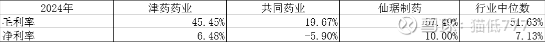 公司2024年毛利率45.45%、净利率6.48%,均略低于同细分行业的仙琚制药和化学制药行业中位数。