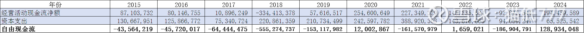 2015-2024年间,公司仅在20、22、24年出现正的自由现金流。