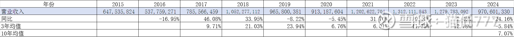 2015-2024间,公司营业收入波动巨大,年度增长率在-24.16%至46.08%之间变动。