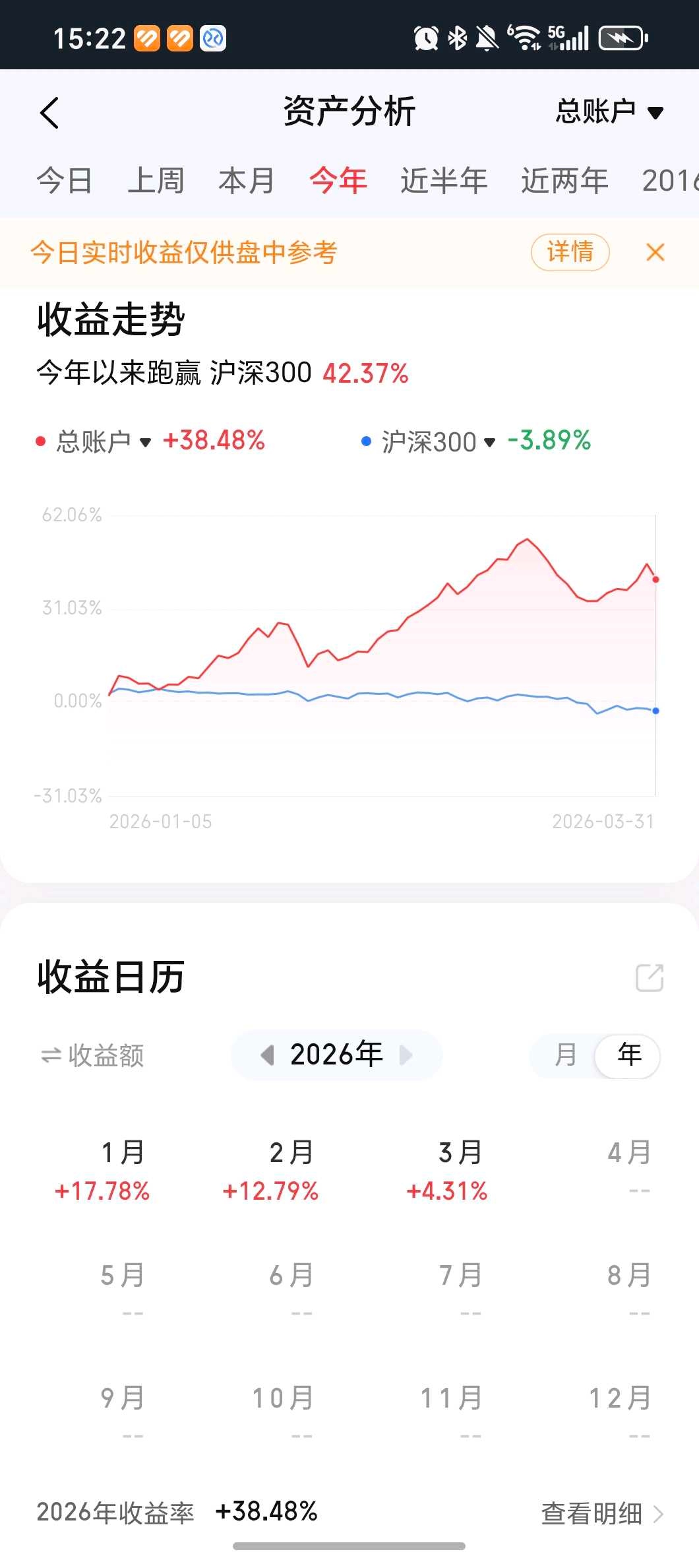 个人建议,仅供参考,对错勿怪。查看图片//@星辉雪夜:回复@星辉雪夜:三月过半,收益45.1%,仓位76%,最近三天市值波动不大,但个股分化很大且个股波动也很大。