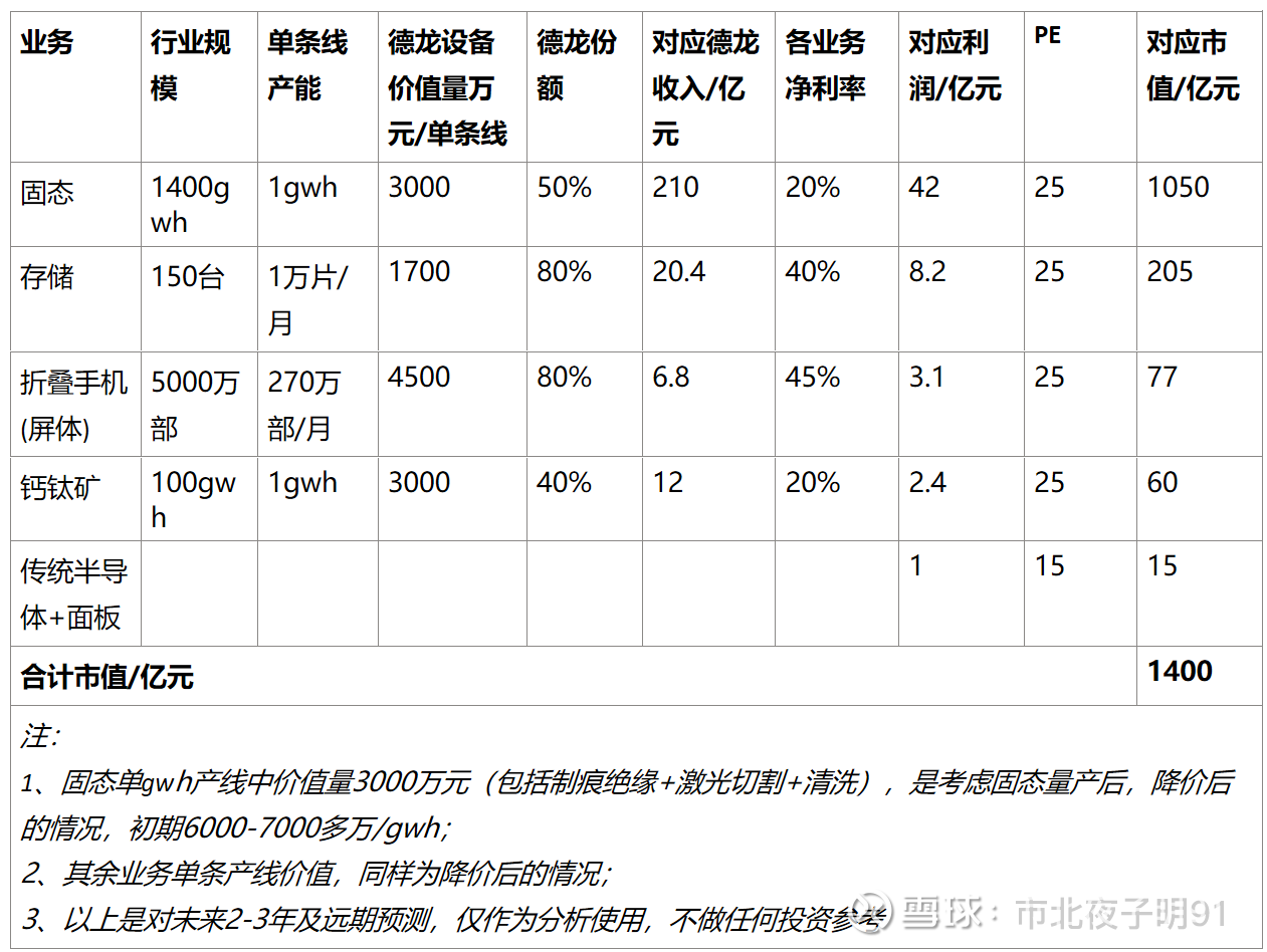 固态:目前有制痕、绝缘、激光切割、激光干燥、新一体化设备共5款固态设备,单gwh产线价值量合计5000+万元。其中制痕绝缘路线在经历25年各家尝试胶框印刷等方法后,最终确定制痕-绝缘为主流路线,德龙截至25年底已交付9台,涉及头部C、B、Y共3个客户,交付给C有4台,其他2家共5台,价值2500万多,9台设备对应合计500mwh产线,对应价值量5000万/gwh。此外切割、干燥等设备价值量2000万/gwh。合计价值量7000万/gwh,小试中试目前独家。