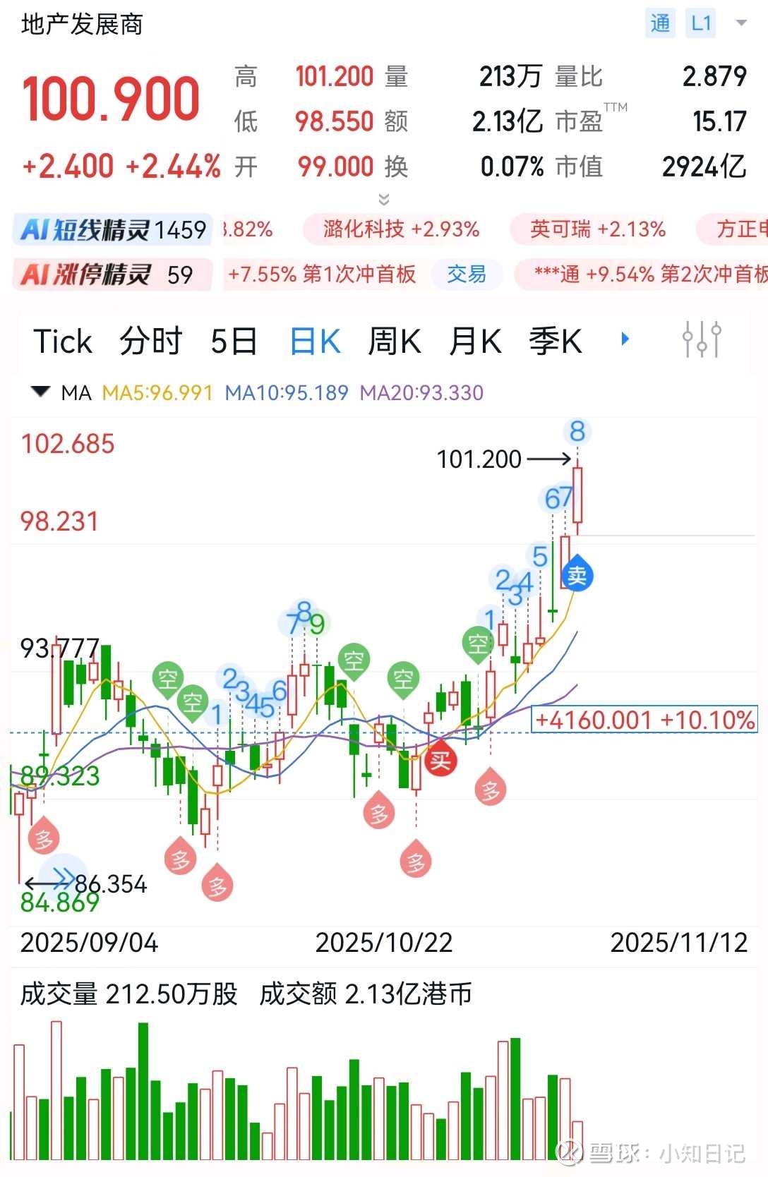 新鸿基地产突破了100,离历史最高111一步之遥。当前基本面是无法支持其历史新高的。总体这支股作为港资地产核心颇具代表性。不能忘了它在内地不少头寸。而港铁公司更受益当前香港地产明显的复苏,所以港铁也就走得更强。