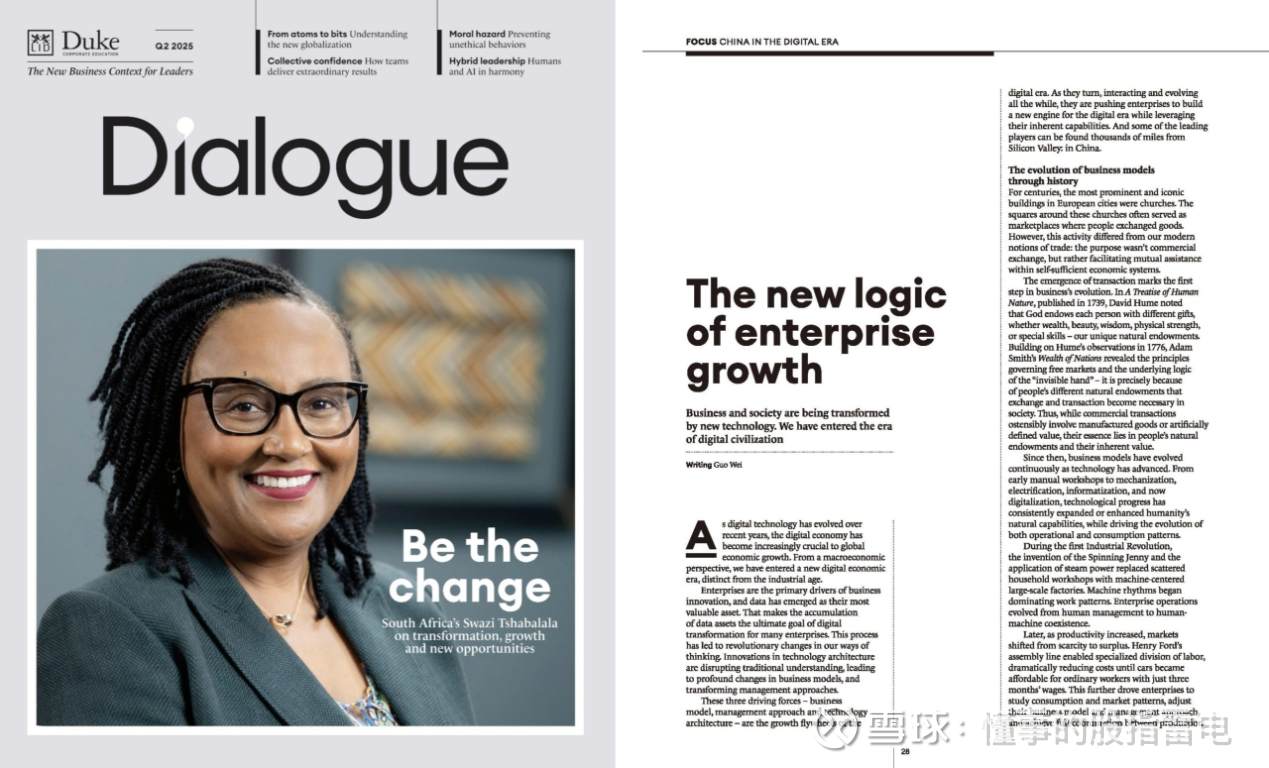 神州数码控股有限公司董事局主席郭为受邀在全球管理思想领域权威期刊《Dialogue》上发表观点性文章。在题为 “The new logic of enterprise growth”的文章中,郭为结合神州数码自身实践和前沿洞察,系统阐述数字经济时代企业持续增长的方法论,引发广泛关注和热议。