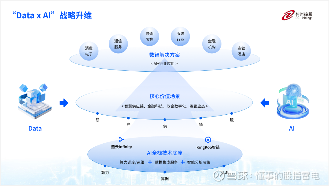 2025年,神州控股依托在大数据和人工智能领域的先发优势,持续推动“Data x AI”战略升维,强化以“燕云Infinity平台”为核心的数据智能技术底座,赋能核心业务场景。伴随国家“人工智能+”战略实施,公司加速为消费电子、通信服务、快消零售、服装行业、金融机构、连锁酒店等行业提供全域数据智能解决方案,赋能客户“研产供销服”全链路数智化转型与管理效能跃迁,驱动产业链价值重构。