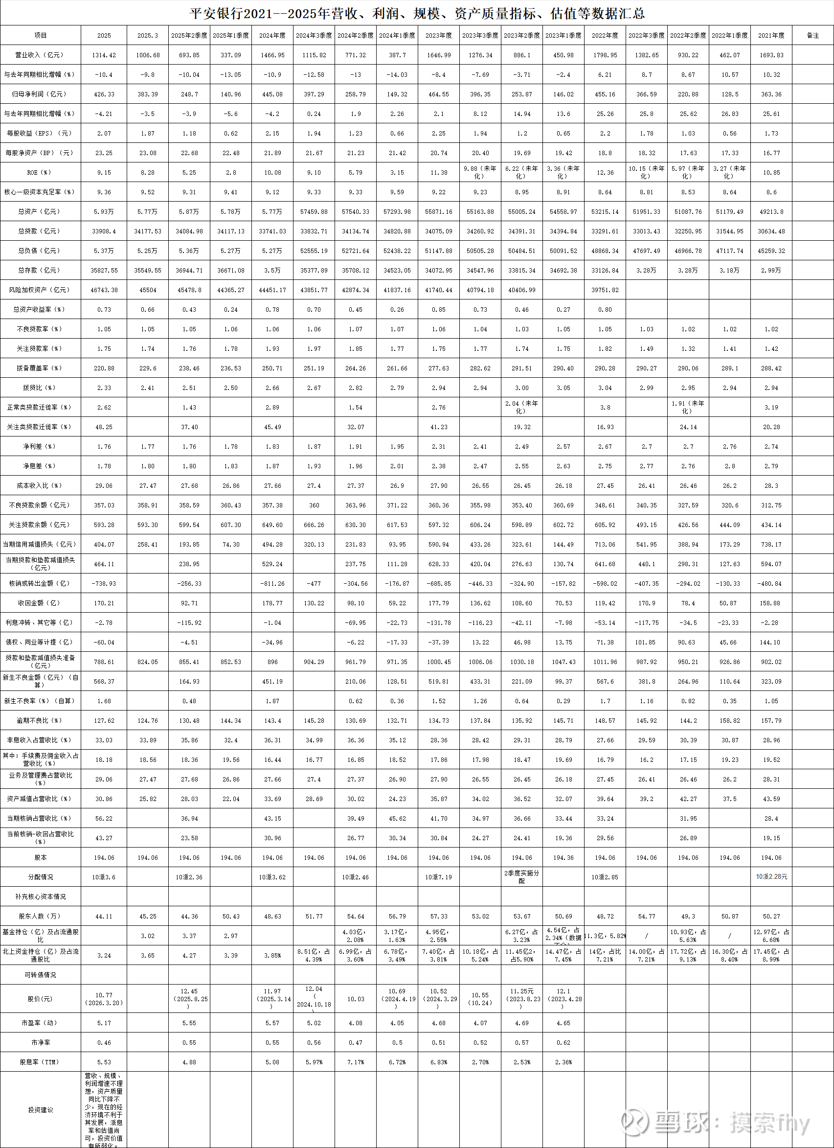 2、净利润负增长-4.21%,也是近10年以来的最低值,虽说有大环境影响,可其他的股份行相对要比他好一些,比如同一天公布年报的中信银行2025年经营就比他强,至少是增长2.98%,其他几家公布业绩快报的股份行业绩增速都比他强,平安银行还是存在自身的问题,我跟踪了其财报十多年,看好其与平安集团的协同效应,也曾持有不少仓位,可进入2022年以来,发现其基本面往下走,与部分城商行差距越来越大,资产质量管控存在不小的问题,发现他就是这样的业务模式,自身已经很难改变,最后只能放弃了。
