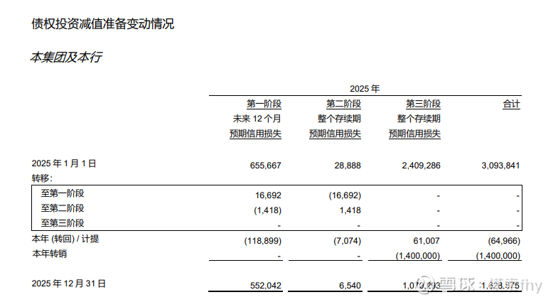 14、在债权投资和其他债权投资方面,2025年债权投资2488.98亿元,比2024年的2972.48亿元降低了几百亿,债权拨备余额为16.29亿元,比2024年的30.94亿降低了14亿多,并不是转回的,主要就是坏账核销的,2025年一次性核销债券投资14亿,也是非常多的,可能是管理层感觉2025年经营的不错,把过去几年在债券方面积累的坏账一次性核销处理,为今后轻装上阵打下基础。具体情况如下: