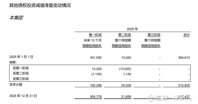 2025年其他债权投资余额为3111.74亿,比2024年的2448.25亿元增加了600多亿,这个增幅不小了,计提的坏账准备余额为5.77亿,比2024年的3.65亿增加了2亿多。