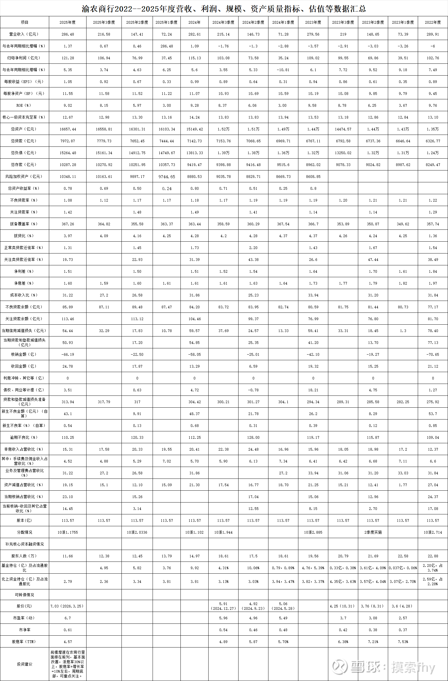 5、核心一级资本充足率为12.67%,比2024年的14.24%下降了1.57个百分点,随着资产规模的增加,贷款的高速增长必然伴随着风险加权资产的增加,核心一级资产充足率有所下降是必然的,2025年其风险加权资产为10348.11亿元,比2024年的8880.53亿元增长了16.53%,远高于贷款规模和利润的增长,充足率有所下降是必然的,好在渝农商行这个指标非常高,加快发展大力开拓业务,适当降低一点核心一级资产充足率,能为股东创造更多的利润,这是个好事。
