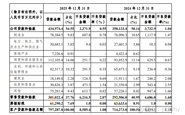 截至 2025 年末,本集团公司贷款不良余额较上年末减少13.61亿元,不良率较上年末下降 0.49 个百分点;零售贷款不良余额较上年末增加 15.30 亿元,不良率较上年末上升 0.47 个百分点。渝农商行在对公房地产方面的贷款占比很低,也没有什么坏账,但零售贷款不良率2.07%比2024年的1.60%升高不少,而对公贷款不良率0.55%比2024年的1.04%大幅下降,这也是其大力开拓对公贷款的原因。