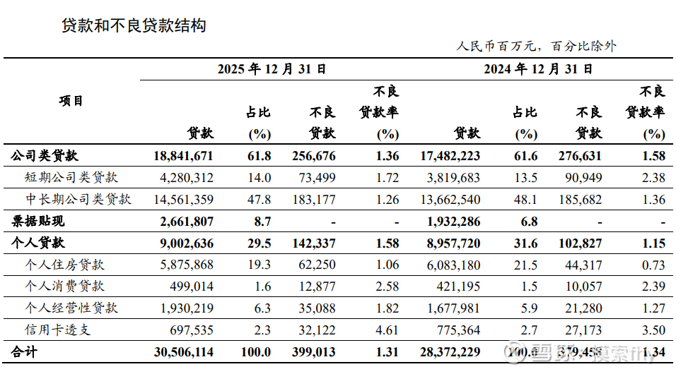 2025年工商银行公司类贷款占比有所增长,个人贷款占比下降不少,贷款增量主要是对公,不良贷款的变化更是这样,对公不良率由2024年的1.58%下降到2025年的1.36%,个人不良率由2024年的1.15%升高到2025年的1.58%,其他银行基本也是这个趋势。这也是业务以对公为主的银行这几年经营情况相对比较好的原因,以个人金融为主的银行比如平安、民生、招商相对比较困难的原因。