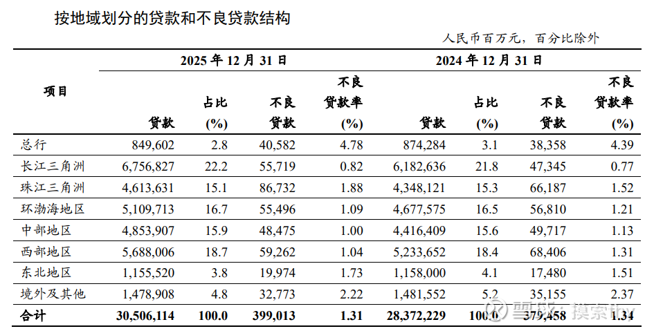 从区域划分看,长三角贷款总量占比提高最多,有2024年的21.8%增加到2025年的22.2%,不良率则是各大区域中最低的为0.82%,虽说仍然比2024年的0.77%有所增加,但整体还算优秀,业务增量大,资产质量最好,这也是这几年位于长三角、成渝、山东等经济发展较好的城商行业绩和资产质量脱颖而出的内在因素。