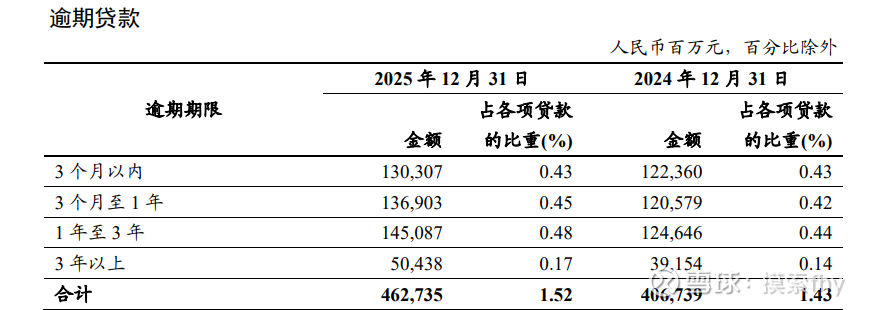 工商银行逾期贷款占比2025年为1.52%,比2024年的1.43%有所升高,逾期不良比116.03%也比2024年的107.19%有所升高,这个数据整体还可以,不算高,主要是个人业务造成的,今后随着经济的好转也会下降的。