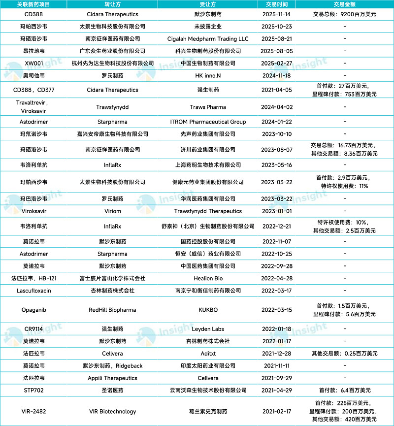 全球流感新药医药交易情况(排除疫苗)