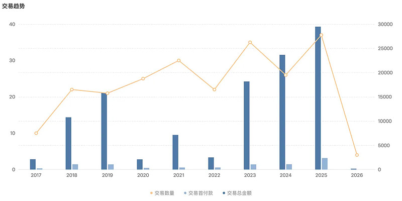 Insight数据库显示,近三年全球小核酸药物领域共达成近百起BD合作,交易笔数和交易金额均在逐年提升,其中2025年达成了30多笔BD合作,交易总金额近300亿美元。