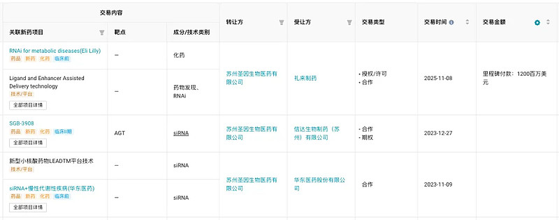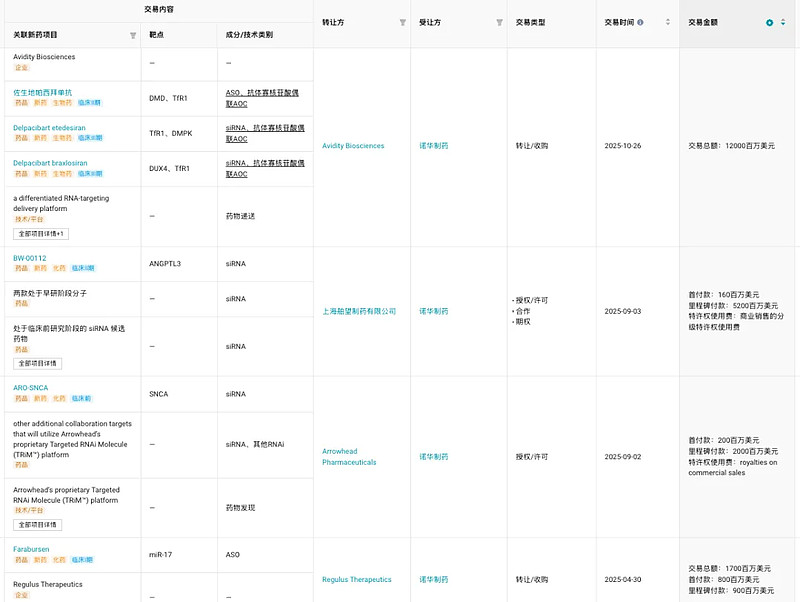 诺华2025年达成的小核酸相关交易