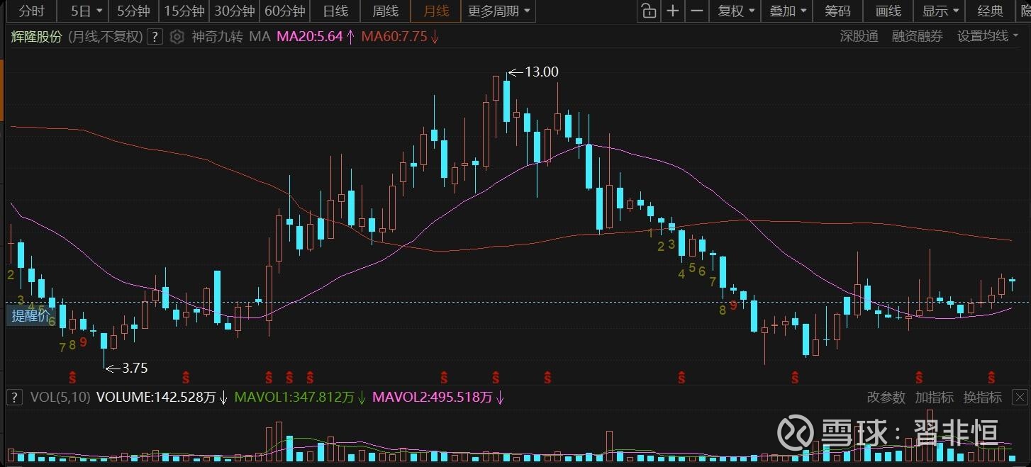 再看个股处于什么方位?前面已经说了短期3个月的交易情况,离主力资金成本不远,主力没多少钱攒。中长期更能透视未来,删除那些无用5、10、30个周期的短期均线,那么多线在屏幕上看得都繁。大道至简,打开周线看20周和60周均线的构造,再打开月线看20月和60月线的构造,观察量价关系。答案一目了然,渣渣辉处于中长期上升的前夜,26年是渣渣辉的大年,这个概率非常大!