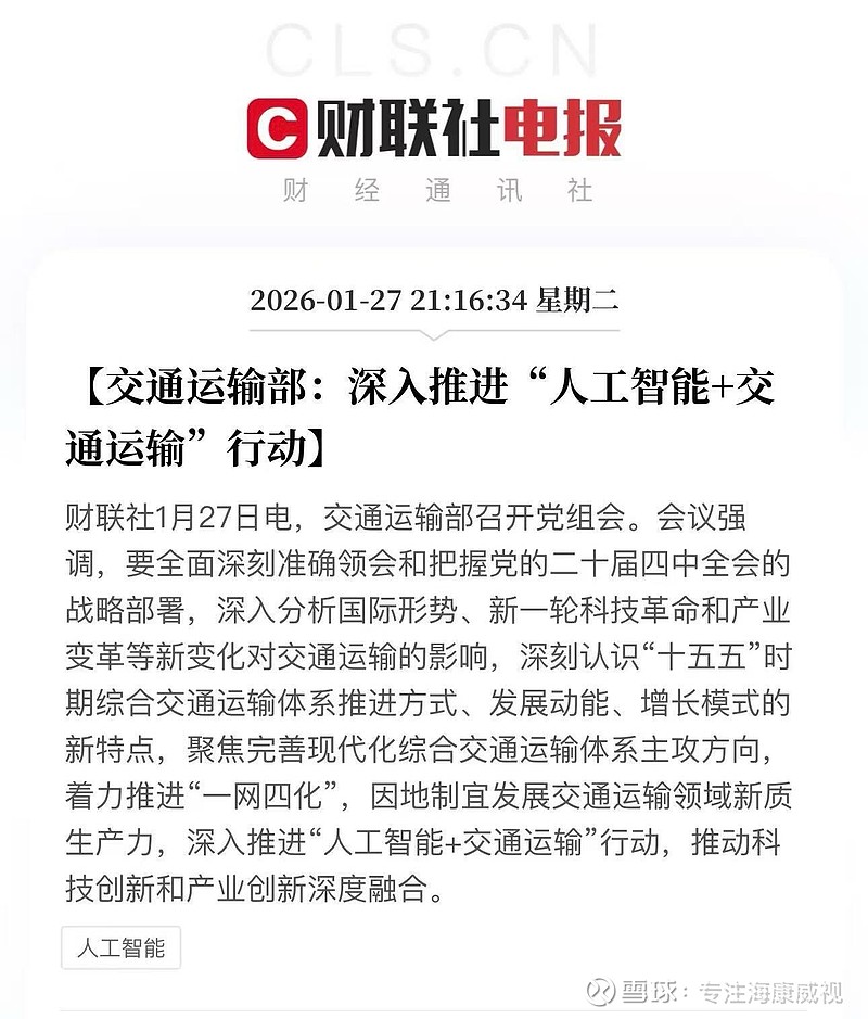 财联社这条“交通运输部深入推进‘人工智能 + 交通运输’行动”的政策,对海康威视长期利好。交通智能化改造提速,订单增量可期交通运输部推动“AI + 交通”,本质是加速交通行业的数字化、智能化转型。海康威视作为AI + 视频监控的龙头企业,在交通领域已有深厚布局(如智慧公路、城市交通治理、物流安防等场景)。