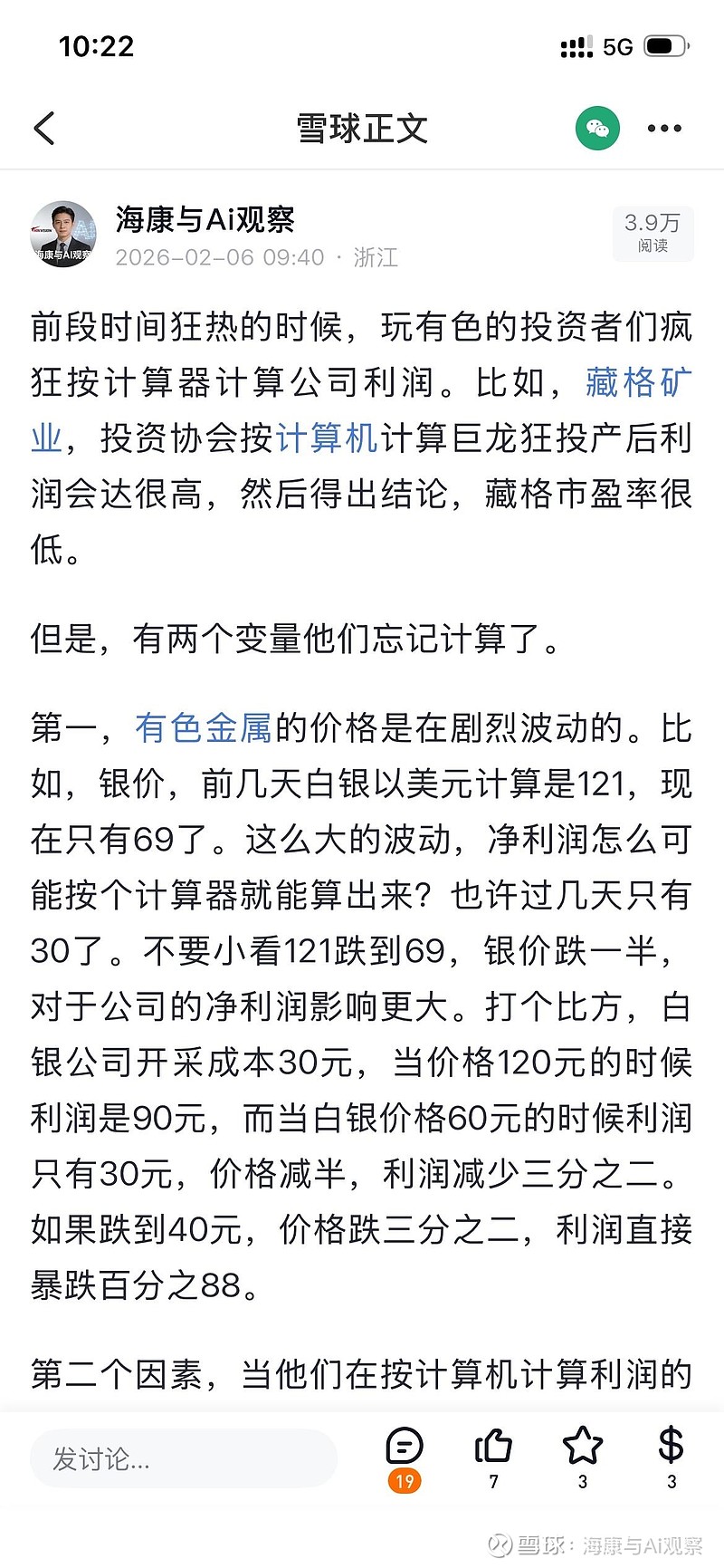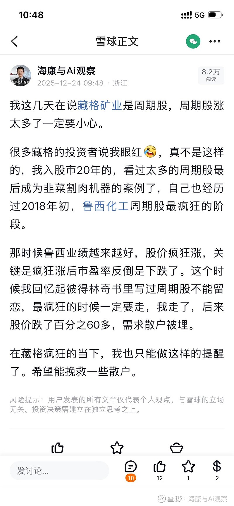 这两次经历,让我对周期股的疯狂有了切肤之痛。而今年年初的银、铜等资源股,走势简直和当年一模一样。AI概念一出来,所有人都说AI要用银、要用铜,需求大增,情绪极度亢奋,一两个月就翻倍。这就是典型的周期股见顶信号。
