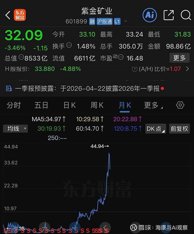 3. 估值杀深不见底:当前PE约16.5倍,看似不高,但矿业周期顶部时,估值会从15-20倍快速下修至8-12倍。若逻辑彻底崩塌,股价可能从32元跌至15-20元,跌幅超40%,参考五粮液、爱尔眼科的下跌幅度,紫金矿业的下跌空间可能更大。