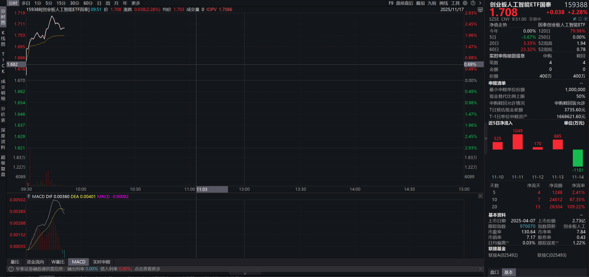 消息面,华为将在11月21日发布AI领域的突破性技术,有望解决算力资源利用效率的难题。利好催化,$创业板人工智能ETF国泰(SZ159388)$ 盘中涨超2.2%,资金持续布局,近10日净流入超2.4亿元。