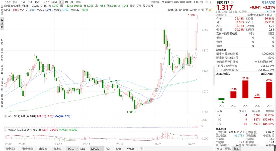 随着2026年春节临近,市场对影视板块的关注度持续升温,叠加资金提前布局档期行情,$影视ETF(SH516620)$ 呈现持续净流入态势,今日继续上涨,涨超3%,成为节前消费复苏主线中颇具代表性的赛道产品。