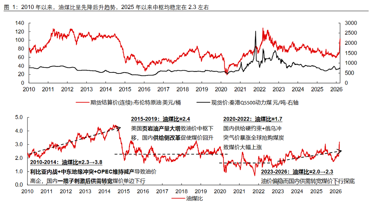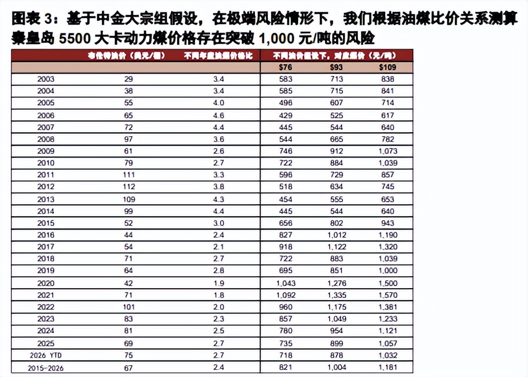 中金公司预计温和、风险、极端风险情形下,2026年油价中枢或达到76、93、109美元/桶。若发生极端风险情形,从历史的油煤比价来看,测算国内动力煤价格或有突破1000元/吨的风险。回顾历史油煤比价关系,2008年油价97美元/桶时,国内煤价达到1090元/吨;2011年油价111美元/桶时,煤价达到857元/吨;2022年油价101美元/桶时,煤价达到1200元/吨。虽然实际价格表现仍取决于届时国内能源保供力度,但地缘冲突持续发酵背景下,煤价的上行风险正在显著增加。